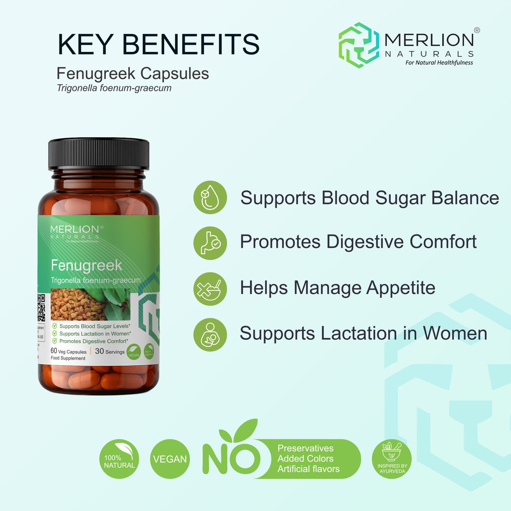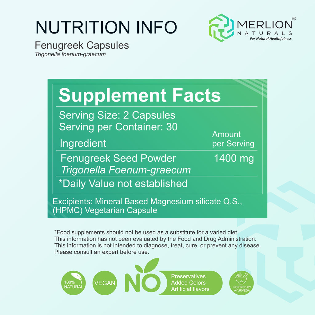 Merlion Naturals Fenugreek Capsule is a natural herbal supplement and contains the goodness of high quality Fenugreek ( Trigonella foenum-graecum ) in form of tablets. Fenugreek is one of the most highly used herbal plants. Due to its slightly sweet and nutty flavour, its seeds and powder are used as a spice all over the world.
